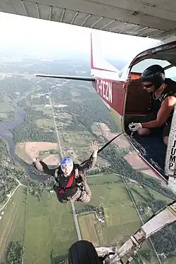 Ein Fallschirmspringer direkt nach dem Absprung mit einer Aufziehleine