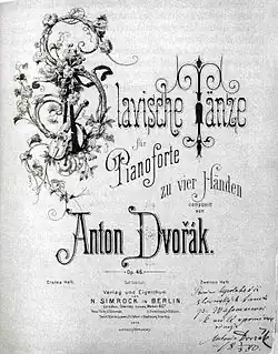 Im Jahr 1877 machte Johannes Brahms seinen Verleger Fritz Simrock auf den noch unbekannten Komponisten Antonín Dvořák aufmerksam, den er als Jurymitglied bei der Vergabe eines Stipendiums für dessen Duette Klänge aus Mähren kennengelernt hatte. Simrock nahm nicht nur die Duette in sein Verlagsprogramm auf, er schlug Dvořák auch vor, eine Reihe von „nationalen Klavierwerken“ nach dem Vorbild von Brahms’ Ungarischen Tänzen zu komponieren. Auch der Titel „Slawische Tänze“ war eine Anregung Simrocks.