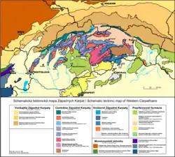 Der geologische Bau der Slowakei ist vielfältig. Zur Flyschzone gehören die äußeren West- und Ostkarpaten in der Nord- und Nordostslowakei, die von den inneren Karpaten durch den Pieninen-Felsengürtel getrennt sind. Weiter folgen innerkarpatische Paläogen-Zonen auf der inneren (südlichen) Seite des Felsengürtels, zu denen Talkessel, Mittelgebirge und Bergländer von Žilina bis etwa Prešov, mit einem Ausläufer bis zur Gegend von Humenné, gehören. Die Kerngebirge gehören zum Fatra-Tatra-Gebiet, die aus Granit, Gneis und Glimmerschiefer im Kern und Kalk und Dolomiten an der Decke bestehen und ziehen sich in zwei Zonen von den Kleinen Karpaten und Tribečgebirge bis zur Tatra und Niederen Tatra. Die Vulkangebirge befinden sich südlich der Kerngebirge und bilden im Wesentlichen das Slowakische Mittelgebirge, weiter zählen die Slanské vrchy und der Vihorlat im Osten und das Kleingebirge Burda bei Štúrovo zu Vulkangebirgen. Das Slowakische Erzgebirge besteht aus zwei eigenständigen Zonen, und zwar der Vepor-Zone im Westen sowie dem Gebirge Čierna hora im Osten sowie der Gemer-Zone mit anderen östlichen Teilgebirgen. Von einigen Autoren wird das Kleingebirge Zemplínske vrchy als eigene tektonische Einheit geführt (siehe auch die Karte rechts), während andere es zu vulkanischen Gebirgen rechnen.[6]