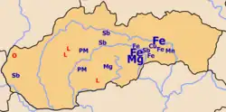 Weiter im Inneren des Landes beginnen die Erhebungen mit dem Tribetz und dem Vogelgebirge bei Nitra beziehungsweise Topoľčany (bis 1340 m). Die Region westlich und südlich von Banská Bystrica ist von verschiedenen Gebirgszügen des Slowakischen Mittelgebirges (bis 1300 m), unter anderem von den Schemnitzer, Kremnitzer Bergen und der Poľana bedeckt. Die gesamte Fläche zwischen Detva (östlich von Zvolen) und Košice nimmt das Slowakische Erzgebirge (Slovenské rudohorie, bis knapp 1500 m) ein, wobei die Höhe generell vom Norden nach Süden sinkt. Östlich von Košice sind bedeutende Gebirge die Slanské vrchy sowie der Vihorlat (bis knapp 1100 m).[6]