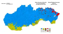 Bei den Volkszählungen in der Slowakei wird zwischen der Nationalität (slowakisch národnosť) im Sinne der ethnischen Volkszugehörigkeit und der Staatsangehörigkeit (slowakisch štátne občianstvo) unterschieden. Die Angaben zur ethnischen Nationalität basieren auf der Selbsteinordnung der Bevölkerung und umfassen alle Personen mit dauerhaftem Wohnsitz auf slowakischem Staatsgebiet. Die ethnische Struktur weicht von den Ergebnissen ab, insbesondere wird der Anteil der Roma wesentlich höher geschätzt als in offiziellen Statistiken. Der sogenannte „Atlas der Roma-Gemeinden“ (2013) gab eine Schätzung von 402.840 Roma (etwa 7,5 %) an;[37] Amnesty International schätzte die Zahl auf 300.000 bis 600.000 (5 bis 10 % der Bevölkerung).[38] Bei der Volkszählung im Jahr 2011 kam es zu gröberen Ungenauigkeiten.[39] Der slowakische Roma-Experte Martin Šuvada schätzte 2015 in seiner Studie die Gesamtzahl der slowakischen Roma auf 450.000 Menschen. Klar sei, dass die Anzahl der Roma wegen deren hoher Geburtenrate weiterhin steige. Die Roma seien die einzige Nationalität in der Slowakei, die sich bei Volkszählungen mehrheitlich nicht zu ihrer Volkszugehörigkeit bekenne.[40]