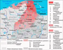 - ↑ Karte entworfen nach: F. Lorentz: Gramatyka Pomorska. Poznań 1927, Faltkarte in der hinteren Umschlagseite (digitalisiertes Bild 78). Braun sind dort die slowinzischen, rot die niederkaschubischen, grün die mittelkaschubischen, violett die oberkaschubischen Varietäten. Die Karte zeigt nicht die Verbreitung im Erscheinungsjahr, wie die russische Karte meint, sondern alle erforschten Varietäten seit Mitte 19. Jh.