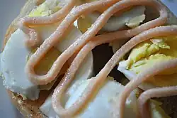 Für Smörgås mit Ei und Kaviarcreme wird Weißbrot, Soft Bröd oder Knäckebrot verwendet. Das Brot wird mit Butter bestrichen, alternativ mit Mayonnaise oder Salatcreme, und mit Salatblättern, Gurkenscheiben und Eischeiben belegt. Anschließend wird die Kaviarcreme („Kalles Kaviar“) direkt aus der Tube auf das Brot gegeben. Garniert wird mit Schnittlauchröllchen oder anderen frischen Kräutern.[8]