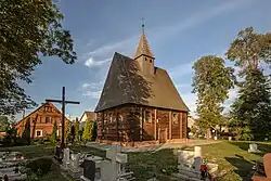 Die römisch-katholische Heilig-Kreuz-Kirche (poln. Kościół Podwyższenia Krzyża Świętego) ist eine Schrotholzkirche und wurde 1580 erstmals erwähnt. Der heutige Bau entstand Anfang des 17. Jahrhunderts zunächst als protestantisches Gotteshaus. 1654 wurde die Kirche rekatholisiert. Der Kirchenbau steht seit 1954 unter Denkmalschutz.[5]