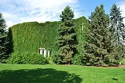 Der freistehende Glockenturm neben den Eingang ist kaum höher als die Kirche. Der Grund für die niedrige Ausführung des gesamten Gebäudes war die Nähe zum ehemaligen Hauptflughafen Oslos auf der benachbarten Halbinsel Fornebu.[4]