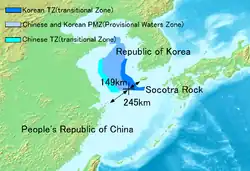 Am 23. November 2013 deklarierte die Volksrepublik China eine Air Defense Identification Zone (ADIZ) über dem Ostchinesischen Meer, einschließlich umstrittener Gebiete wie dem Socotra-Fels oder den Senkaku-Inseln.[5] Jeder Überflug müsse fortan in China angemeldet werden. Die südkoreanische Regierung kündigte daraufhin an zu überprüfen, ihre eigene ADIZ ebenfalls auf den Socotra-Felsen auszudehnen.[6]