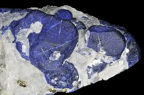 Lasurit (auch Ultramarin) ist Bestandteil des Mineralgemischs Lapislazuli. Sodalith mit S3−- und S2−-Radikalen erzeugt durch die Anordnung (Koordination) in den Sodalith-Käfigen eine intensiv blaue Farbe.