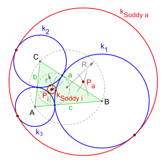 - Dabei bezeichnet den Flächeninhalt von , den Inkreisradius, den Umkreisradius und den Umfang. Das Pluszeichen gilt für den inneren Soddy-Kreis, das Minuszeichen für den äußeren.