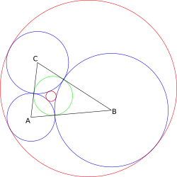 - Die Kreise um die Ecken des Dreiecks werden vom äußeren Soddy-Kreis für einschließend, für ausschließend berührt. Im Grenzfall () ergibt sich ein unendlicher Radius, d. h. aus dem äußeren Soddy-Kreis wird eine gemeinsame Tangente.