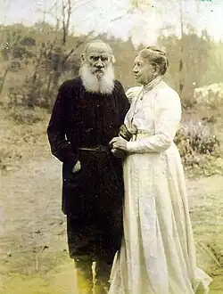 1861 legte sie an der Moskauer Universität das Examen zur Hauslehrerin ab. Im selben Jahr wurde in Russland die Leibeigenschaft aufgehoben und in der russischen Intelligenzija erwuchsen Hoffnungen auf Liberalisierung des Zarenreichs. Als Sofja achtzehn Jahre alt war, machte ihr der 16 Jahre ältere, zu dieser Zeit bereits als Schriftsteller bekannte Tolstoi, der ein Bekannter der Familie war, einen Heiratsantrag.[2] Die Verlobungszeit betrug knapp eine Woche, am 23. September 1862 heirateten sie im Kreml in der Mariä-Verkündigungs-Kathedrale. Tolstaja zog auf Tolstois Landgut Jasnaja Poljana. Ihre eigenen literarischen Ambitionen gab Sofja auf und verbrannte ihre Schreibversuche und Tagebücher vor der Eheschließung. Tolstoi wiederum gab ihr seine Tagebücher zu lesen, aus denen sie von seinem sexuell ausschweifenden Leben vor der Ehe erfuhr (diese Szene verarbeitete er später literarisch in Anna Karenina und im 5. Kap. der Kreutzersonate).
