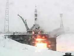 Der Start war ursprünglich für den 22. September 2011 geplant. Nach der Fehlzündung der dritten Stufe einer Sojus-Rakete am 24. August wurde die Mission zuerst auf Ende Oktober oder Anfang November verlegt, um zwei unbemannte Testflüge durchführen zu können.[10] Der Start erfolgte schließlich am 14. November 4:14 UTC bei dichtem Schneetreiben von der Startrampe 1 des Weltraumbahnhofs Baikonur.[3][4]