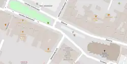Nördlich und südlich des Areals vor der Kirche verlaufen die Straßen Kostelní (deutsch: Kirche) bzw. Železná („eiserne“ [Straße]), während die Straße die den westlichen Hauptteil des Platzes umgibt, den Namen des Platzes (náměstí Sokolovské) hat.