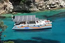 Die SolarWave ist ein Katamaran, der ausschließlich von Elektromotoren angetrieben wird und dazu konzipiert wurde, ohne Segel und ohne fossile Brennstoffe völlig autark große Strecken zurückzulegen. Die Energie zur Versorgung der zwei Elektro-Motoren und des Haushaltes wird von Solarpaneelen erzeugt und in Lithium-Polymer-Batterien gespeichert.