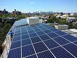 Die Vereinigten Staaten gehören zu den Pionieren der Solarenergie. Charles Fritts installierte 1884 auf einem Dach in New York City die weltweit erste Photovoltaikanlage mit Selen-Zellen mit einem Wirkungsgrad von 1 %.[5] Die Entwicklung der Solartechnologie stagnierte jedoch zu Beginn des 20. Jahrhunderts angesichts der zunehmenden Verfügbarkeit, Wirtschaftlichkeit und Nützlichkeit von Kohle und Erdöl. In den 1950er Jahren verwendeten die Bell Telephone Laboratories in ihrer Forschung Siliziumwafer mit einer dünnen Borbeschichtung. Die „Bell Solar Battery“ hatte einen Wirkungsgrad von 6 % und erzeugte mit einem Quadratmeter Panel 50 Watt. Der erste Satellit (Vanguard 1, ein Forschungssatellit der NASA) mit Solarpaneelen wurde 1957 gestartet.[6]
