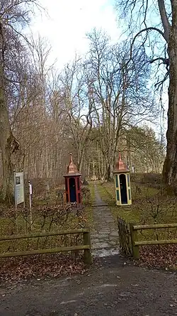 Im Vorfeld errichtete der Volksbund eine Säule. Sie wird von einer Skulptur gekrönt, die den Wundervogel Phönix darstellt, der beim Herannahen des Todes einen Horst aus wohlriechenden Hölzern baut, sich darin verbrennt und verjüngt aus der Asche wieder aufersteht. Phönix ist das Sinnbild der Unsterblichkeit und der ständigen Erneuerung der Völker.