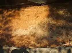 Der Bad Nauheimer Solgraben ist ein um 1845–1850 künstlich angelegter offener Kanal zur Befüllung des Solebeckens mit Sole und des Betriebs der daraus gespeisten Gradierwerke, die in Bad Nauheim Gradierbauten genannt werden. Die Sole entstammt Bohrungen, die in den 1840er Jahren im heutigen Sprudelhof nach einem leichten Erdbeben niedergebracht worden sind[11]. Ein Teil dieser Sole wurde für den Kur- und Badebetrieb verwendet. Heute wird sie vom Sprudelhof in unterirdischen Leitungen zur „Quelle“ des Solgrabens geleitet. Sein anfangs warmes rostfarbenes Wasser ist sinnlich wahrnehmbar reich an Salz und eisenhaltig. Trotz der physikalischen und chemischen Verhältnisse existieren pflanzliches und bakterielles Leben in ihm, das eher farblose Biofilme ausbildet. Durch die kontinuierliche Änderung der physikalischen und chemischen Verhältnisse in der Sole fallen mit der Zeit gelöste Mineralien in Form von weißen schuppenartigen Flocken aus und sammeln sich stellenweise am Boden. Deshalb und weil der Solgraben gefallenes Laub aufnimmt, muss er immer wieder gereinigt (entschlammt) werden.