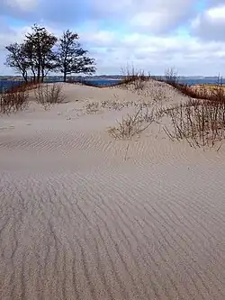 Blick von der Waldkante hinunter auf den Strand von Solitüde (Winter)