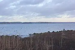 - Von Solitüde aus ist der gegenüberliegende Fördebereich von Wassersleben bis zu den nahgelegenen Ochseninseln zu erkennen. Ebenfalls zu sehen ist das auf einer Landnase gelegene hinter Bäumen versteckte Flottenkommando im benachbarten Meierwik.