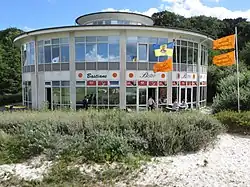 Zum Ende des 20. Jahrhunderts wurde der Solitüder Strandpavillon westlich vom Weg zur Badebrücke errichtet.[25][26] In ihm fanden ein Restaurant, ein Kiosk, sanitäre Anlagen sowie die DLRG Platz.[27] Ab 2014 wurden der Restaurant- und Kioskbereich des Pavillons zeitweise nicht mehr genutzt[25]; seit Mai 2016 befand sich darin ein Bistro.[28] Seit der Insolvenz des neuen Pächters im Jahr 2023 wird der Pavillon derzeit nicht bewirtschaftet.