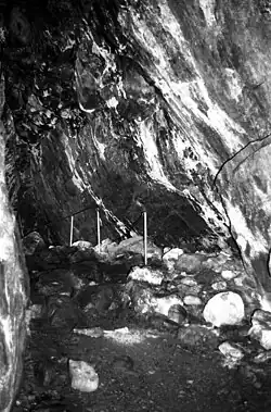 Am 3. Mai 1912 wurde die Höhle von drei jungen Männern aus dem Dorf besucht.[3] Sie brachten Seile, Leitern und Laternen mit, um ihr Inneres zu erkunden.[4] Der Archäologe Theodor Petersen vom Universitätsmuseum Drontsheims besuchte die Fundstelle im Juli desselben Jahres.[5][6] Eine genauere Untersuchung wurde 1913 von Petersen und dem Architekten Claus Hjelte durchgeführt.[7] 1914 schrieb Petersen den ersten Bericht über den Fund in einer Festschrift zu Ehren seines Kollegen Karl Ditlev Rygh.[8]