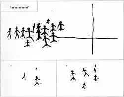 Die Hauptgruppe besteht aus 13–14 menschlichen Figuren links von einem großen Kreuz. Die Figuren sind zwischen 30 und 100 cm groß. Eine dieser mutmaßlich menschlichen Figuren wird auch als Keule[3] oder als Fackel gedeutet.[1] Zudem werden mehrere der Figuren als „phallisch“ beschrieben, d. h. mit einem markanten Penis.