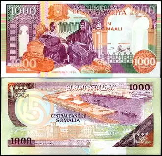 Die Münzen sowie die in den 1980er Jahren gedruckten Scheine zu 5, 10, 20, 50 und 100 Schilling sind praktisch wertlos. Seit Jahren zirkulieren nur noch Scheine zu 1000 Schilling, wobei der Falschgeldanteil vom Internationalen Währungsfonds auf bis zu 98 % geschätzt wird.[1] Zahlungsverkehr wird in Somalia daher häufig in Fremdwährung bzw. in den letzten Jahren stark zunehmend über Mobile Payment abgewickelt. Marktbeherrschendes System ist EVC Plus, ein Service des in Somalia führenden Mobilfunkanbieters Hormuud.[1]
