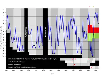 Nach dem Ersten Weltkrieg konnte in der ersten Saison wurde ein fünfter Platz erzielt werden, was die beste Platzierung zwischen den kriegen bleiben sollte. Zumeist platzierte sich das Team im Mittelfeld. Spieler wie Arthur Wellard und Harold Gimblett waren in dieser Zeit Teil der Nationalmannschaft.[4] Über den Zweiten Weltkrieg war der Club gut hinweggekommen und so erzielte man nach Spielbeginn 1946 ein vierter Platz. Jedoch sollte dies nicht anhalten und in den 1950er Jahren platzierte man sich vier Saisons in Folge (1952, 1953, 1954, 1955) am Tabellenende. Nach dieser Phase folgte über bis in die 1960er Jahre ein konstante Platzierung im Mittelfeld und insgesamt drei Mal (1958, 1963, 1966) konnte sich das Team auf einen dritten Platz platzieren. Die anschließende Schwächephase mit einem letzten Platz 1969 führte dann nach einem Neuaufbau unter Brian Close zu ersten Titeln in den One-Day-Wettbewerben zum Ende der 1970er Jahre. Innerhalb von zwei Tagen gelang 1979 der Gewinn des Gillette Cups und der John Player League.[4] Spieler wie Ian Botham, und die West-Inder Viv Richards und Joel Garner waren die wichtigsten Spieler der nun begonnenen Hochphase. 1981 und 1982 gelang der Gewinn des Benson & Hedges Cups und 1983 wurde noch einmal die NatWest Trophy gewonnen. Auch in der County Championship konnte Somerset sich wieder höher platzieren und es erfolgte ein weiterer dritter Platz in 1981.