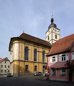 Eine erste Bartholomäuskirche wurde um 1260 erbaut;[8] von ihr steht noch der Turm. Das Kirchenschiff wurde in den Jahren von 1666 bis 1672 durch einen Neubau ersetzt. Dessen Fundamente und die Bauplanung und -ausführung insgesamt waren mangelhaft; die Mauern begannen sich zu neigen. Bei einem schweren Sturm 1739 stürzten große Teile dieser zweiten Bartholomäuskirche ein.[9] Nach Plänen von Leopoldo Retti wurde 1739/1740 ein neues, nunmehr drittes Kirchenschiff errichtet.[10] Sehenswert ist die 1621 von Georg Brenck dem Jüngeren geschaffene Kanzel mit zahlreichen holzgeschnitzten Darstellungen biblischer Personen und Ereignisse.[11] Erhalten ist auch die Kanzeluhr, die den Pfarrer dazu anhielt, die vorgegebene Predigtdauer einzuhalten.[12]