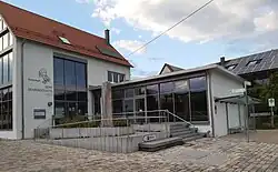 - Das Dorfgemeinschaftshaus in der Dorfmitte. Im Eingangsbereich steht ein Büchertauschregal. Im Erdgeschoss befindet sich ein Veranstaltungsraum mit Klavier. Im Obergeschoss befindet sich ein Raum der bürgerlichen Gemeinde und ein Raum der evangelischen Kirchengemeinde.
