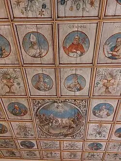 Hippoltskirch, KassettendeckeEine Kapelle St. Martin in Hippoltskirch wird schon 1144 erwähnt, der heutige Bau von 1778/81, renoviert 1953. Kassettendecke mit gemalten Feldern, von der Sankt-Ulrichskapelle (der Dorfkirche) übernommen. Barocke Altäre. Spätgotischer Sakramentsschrein, über den Eingang versetzt. Marienstatue um 1500. Die Hippoltskirche ist seit dem 16. Jahrhundert eine einst rege besuchte Marienwallfahrtsstätte. Die Decke als Monument historique klassifiziert[2]