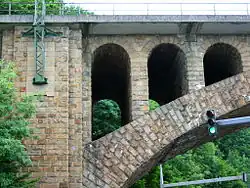 Die Form des Bogens war durch die Höhe der Schwebebahn bedingt. Dadurch erhöhte sich die Schienenoberkante um 1,25 Meter, was aber die örtlichen Verhältnisse ohne Nachteile gestatteten. Zur Vermeidung von starken Nebenspannungen, infolge Ausrüstens und Wärmeschwankungen, wurde das Bauwerk als Dreigelenkbogen mit zwei Kämpfergelenken in einem Abstand von 50 Metern und einem 5,65 Meter höher liegenden Scheitelgelenk ausgeführt. Alle Gelenke bestehen aus Stahl. Am Scheitel des Gewölbes beträgt die Stärke 1,7 Meter, die Stärke an den Widerlagern 3,7 Meter. Die Übermauerung ist durch drei Meter weite Spargewölbe durchbrochen. Die Widerlager sind im Fels gegründet. Sie lagen auf der Westseite zu Tage und im Osten acht Meter tief im Gelände.[2]