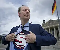 Martin Sonneborn als Weltretter vor dem Berliner Reichstag.
