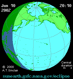 Die ringförmige Sonnenfinsternis vom 10. Juni 2002 spielte sich hauptsächlich im Pazifik nördlich des Äquators ab. Die Dauer der ringförmigen Phase betrug in der Mitte der Finsternis nur 23 Sekunden und war damit extrem kurz. Dies lag daran, dass der scheinbare Durchmesser des Mondes nur geringfügig kleiner war als der der Sonne. Die Verfinsterung wurde also zum Zeitpunkt der größten Bedeckung fast total, der von der Sonne um den Mond herum sichtbare Rand war daher äußerst schmal.