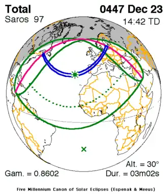 - ↑ Total Solar Eclipse of 447 December 23 NASA. Abgerufen am 6. Juni 2020.
