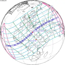 - ↑ a b c Die Dauer der Totalität, die Uhrzeit der Mitte der Totalität, sowie der Grad der Bedeckung, wurden mit der interaktiven Karte der NASA ermittelt (Total Solar Eclipse of 2060 Apr 30, Google Maps and Solar Eclipse Paths)