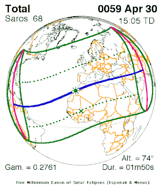 Der Kernschattenbereich begann im heutigen Venezuela, überquerte nach dem Atlantik Nordafrika in östlicher Richtung, streifte Griechenland, die Türkei, überquerte Syrien, den Irak, den Iran und endete schließlich in Pakistan. Der Höhepunkt der Sonnenfinsternis befand sich im heutigen Marokko. Die Sonnenfinsternis gehört zum Saroszyklus 68.[2]