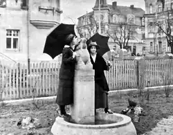 Auf der östlichen Seite der Villa wurde ein Brunnen mit einer hohen Säule errichtet, auf welcher der Froschkönig auf einer Kugel thront.[25] Aus dessen Maul sprudelt das Wasser in einem Bogen in ein darunter liegendes Becken.