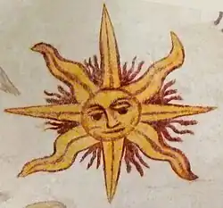 Andere Version des „Sonnenkreuzes“, in der Form eines achtspeichigen Rades (ohne Zusammenhang mit vielen zu der Zeit in der Heraldik verwendeten Radsymbolen). Diese können als Markierung der Kreuz-Viertel-Tage (Mitte der Jahreszeiten) zusammen mit den die der Tagundnachtgleichen und Sonnenwenden markierenden Speichen verstanden werden.