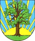 Blasonierung: „In Blau auf grünem Boden eine natürliche Eiche vor einer aufgehenden goldenen Sonne.“