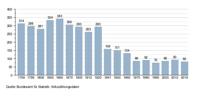 - ↑ Daten der Eidgenössischen Volkszählungen ab 1850 nach Gemeinden. (XLSX; 10 MB) Bundesamt für Statistik, Neuchâtel, 12. Juli 2024, abgerufen am 19. Januar 2025 (Öffnung in Excel nur über "Anhang/Excel-Datensatz" möglich).