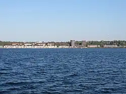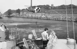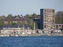 Später diente der Marinehafen der Reichs- und Kriegsmarine als Ausbildungsstätte für Seeoffiziere. In den 1930er Jahren wurde der Marinehafen Mürwiks stark umgebaut und erweitert. Der Marinestützpunkt wuchs in den 1930er Jahren in Form großer Backsteinbauten südwärts bis an die Ziegeleistraße heran, so dass der Strand Klein-Westerland verschwand.[4][5] Zudem wurden in dieser Zeit auch oberhalb der Torpedostation eine große Anzahl Gebäude errichtet, auf diese Weise entstand die Nachrichtenschule.[9] Am 28. Mai 1936 fand ein streng geheimer Besuch Adolf Hitlers in Mürwik statt. Der Diktator reiste mit der Aviso Grille an[10] und nahm am Abend am Nachttorpedoschießen des zeitgleich eingetroffenen Panzerschiffes Admiral Graf Spee teil.[11][12][13] Vier Jahre zuvor war Hitler schon einmal in Flensburg gewesen (Vgl. Wahlkampfauftritt von Adolf Hitler im Flensburger Stadion 1932).