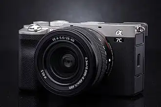 Die Sony Alpha 7C (α7C intern ILCE-7C) ist eine spiegellose Systemkamera (DSLM) mit Vollformat-Bildsensor. Zur Markteinführung im Oktober 2020 wurde sie zu einem Preis von 2100 Euro angeboten.[1] Neben den bereits bekannten Serien Sony Alpha 7S und 7R ist die Sony Alpha 7C eine verkleinerte Version mit einem Fokus auf eine kompakte Bauart.