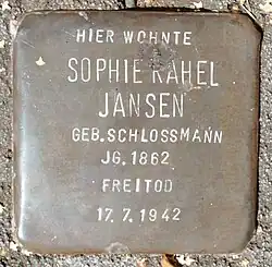 - ↑ https://www.stolpersteine-hamburg.de/index.php?&MAIN_ID=7&p=98&BIO_ID=759 : Sophie Rahel Jansen, Kurzbiografie zum Stolperstein, abgerufen am 17. Januar 2014.