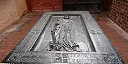 Die Grabplatte aus Bronze mit dem lebensgroßen Abbild der auf einer Granatapfeldecke ruhenden Herzogin bedeckte zunächst bis 1880 ihre Gruft am Hauptaltar der Kirche des Dominikanerklosters, kam dann in die Marienkirche und befindet sich seit deren Zerstörung in einer der nördlichen Seitenkapellen der Nikolaikirche.