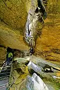 Der Weg führt durch einen etwa drei Meter langen, sehr engen Gang auf eine Plattform im oberen Teil der ersten Abteilung der Höhle. Direkt vor dem Weg, der dort nach links führt, befindet sich das „Elefantenohr“, eine freihängende Sinterfahne von mehr als einem Meter Länge. Als Gegenstück hat sich am Boden ein Stalagmit gebildet, der „Bienenkorb“. Der Weg führt dann an der „Orientalischen Stadt“ vorbei und biegt in einem Halbkreis nach rechts ab. Die „Orientalische Stadt“ befindet sich links in halber Höhe in einer kleinen Höhlung und besteht aus zahlreichen Kerzenstalagmiten. Anschließend führt eine Treppenanlage mehr als zehn Meter nach unten, wo sich ein aus Knochen zusammengestellter Höhlenbär der kleinen Höhlenbaerenrasse Ursus spelaeus eremus[20] befindet. Die Versinterungen an der rechten Wand erinnern an einen Wasserfall und gaben Anlass, der Formation ebendiesen Namen beizulegen. An der Decke befinden sich Sinterfahnen, vereinzelt auch Sinterröhrchen. Am Boden liegen mit Sintermasse überzogene ur- und frühgeschichtliche Knochen, besonders Rentiergeweihabwurfstangen und ein Mammutbecken die vom Cromagnon-Menschen des Gravettian wahrscheinlich im schamanischen Kontext in der Höhle an einer Stelle deponiert wurden. An mehreren Stellen haben sich auch Stalagmiten mit Tropftrichtern gebildet.