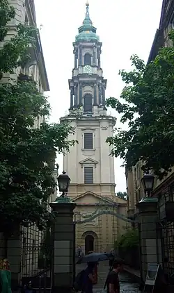 Der filigran gestaltete Westturm ist in der frühen Barockzeit hinzugebaut worden und gilt inzwischen als der einzige erhaltene barocke Kirchturm in Berlin.[1] Er steht auf einem fast quadratischen Unterbau, der sich über drei Geschosse erhebt. Im Erdgeschoss befindet sich das Kirchenportal zwischen Doppel-Pilastern und unter einem Dreiecksgiebel. Die folgenden zwei Geschosse sind durch Wandvorlagen zusammengefasst und über einem sich verkröpfenden Gesims abgeschlossen. An dieser Stelle hält eine Eisenbrüstung den Turm zusammen, die eine aus Stein ersetzt. Schließlich erheben sich darüber zwei Glockengeschosse mit dem dreistimmigen Geläut hinter rundbogigen Schallöffnungen. Eine reich bewegte kupferne Haube mit einer obeliskartigen Spitze bildet den Turmabschluss.[3]