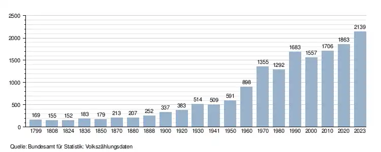 - ↑ Daten der Eidgenössischen Volkszählungen ab 1850 nach Gemeinden. (XLSX; 10 MB) Bundesamt für Statistik, Neuchâtel, 12. Juli 2024, abgerufen am 29. April 2025 (Öffnung in Excel nur über "Anhang/Excel-Datensatz" möglich).
