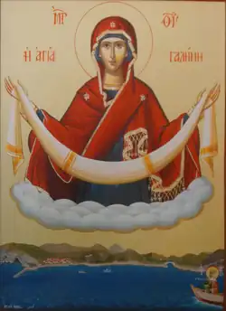 Ikone der Agia Galini zeigt im unteren Bereich wie Aelia Eudocia wohlbehalten den Hafen von Soulia erreicht.