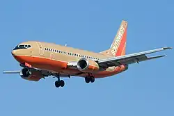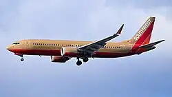 ocker bzw. sandfarben, Rumpfunterseite rot, Seitenleitwerk ocker, rot, orange mit weißem Schriftzug „SOUTHWEST“