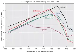 - ↑ Lebenserwartung in Teilen Afrikas unter 33 Jahre. ( des vom 5. Oktober 2007 im Internet Archive) Info: Der Archivlink wurde automatisch eingesetzt und noch nicht geprüft. Bitte prüfe Original- und Archivlink gemäß Anleitung und entferne dann diesen Hinweis. vista verde news, abgerufen am 18. Dezember 2006.
